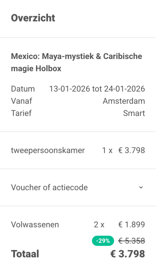 MexicoPlotseling verschijnt het voor je… Chichén Itzá: een modern wereldwonder, 24 meter hoog en vol mystieke Maya-historie. En dat is nog maar een van de talloze hoogtepunten die je te wachten staan in Mexico! Eerst rijd je naar Tulum: tussen jungle en droomstranden ontdek je mysterieuze cenotes en treed je in de voetsporen van de Maya’s. Over de Maya’s gesproken: de ruïnestad Uxmal neemt je mee op een reis door de tijd, voordat Mérida je terugbrengt naar het hier-en-nu. Kleurrijk, bruisend, levendig en overal die onvergelijkbare Mexicaanse levenshouding. Volgende halte: Valladolid, de hoofdstad van de cenotes! Je vindt deze magische natuurlijke zwembaden op elke hoek. Kan het nog beter worden? Jazeker, breng een bezoekje aan Las Coloradas. Dit roze meer ziet er zo surrealistisch uit dat je je afvraagt of je droomt. Ook het eiland Holbox is schitterend… Caribische vibes, eindeloze zandstranden en magische zonsondergangen vormen de perfecte afsluiting van je roadtrip avontuur! Dus, waar wacht je nog op?