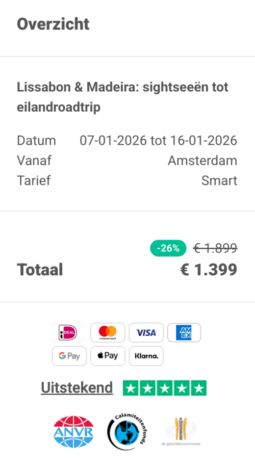 PortugalPortugal roept en hard ook! Je begint in Lissabon tussen kleurrijke huizen, levendige markten, prachtige paleizen en de zee op een steenworp afstand. Dan begint je roadtrip op Madeira: cruise in je huurauto door de wildernis, waar je versteld zult staan van de vulkaanlandschappen, de indrukwekkende natuur en de Atlantische Oceaan. Luister naar het rustgevende geluid van de golven op een van de hoogste kliffen van Europa en neem een duik in bruisende lavapools. Avontuurlijke hikes in de bergen en dolfijnen en walvissen spotten op de open zee garanderen je onbeschrijflijke herinneringen. Dit is het beste van Portugal, in één onvergetelijke rondreis.