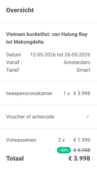AziëMystiek, natuur, avontuur… en dat alles in één land: Vietnam! Deze rondreis neemt je mee van noord naar zuid en laat je zien hoe divers dit land precies kan zijn. Laat je meeslepen door de drukte van Hanoi, ontdek de vele bezienswaardigheden en proef het lekkerste streetfood van de stad. Dan wordt het tijd voor een groen contrast: bemoste, steile kalkstenen kliffen die de hemel in torenen, omringd door groene rijstvelden en kleine riviertjes die door het landschap kronkelen. Halong Bay is de perfecte achtergrond voor een onvergetelijke reis! Een nachtelijke treinrit later sta je in het betoverende Hoi An, waar kleurrijke papieren lampions en magische lantaarns je naar nieuwe avonturen leiden. En dan is het tijd voor de laatste halte: in Ho Chi Minhstad baan je je een weg door de dichte jungle van de Mekongdelta of laat je je meeslepen door de vibe van de metropool. Van stadswandelingen en streetfood crawls tot uitjes naar het platteland, in Vietnam is alles mogelijk!