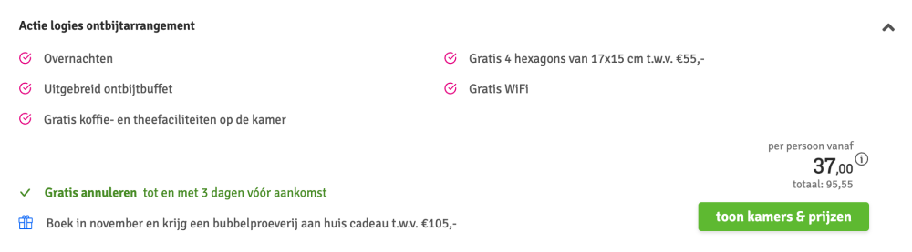 Disclaimer: deze prijs is excl. €14,95 boekingskosten per boeking.