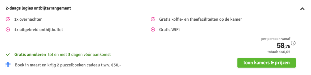 Disclaimer: deze prijs is excl. €14,95 boekingskosten per boeking.