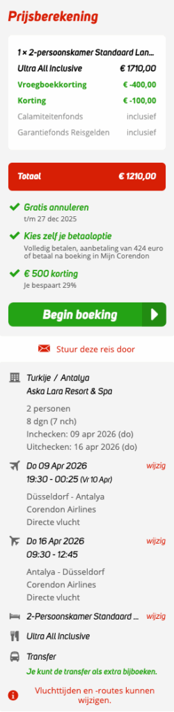 TurkijeEen fijn hotel voor jong én oud: welkom bij 5-sterren Aska Lara Resort & Spa in het gelijknamige Lara. Dit mooie hotel is van alle gemakken voorzien en zorgt ervoor dat jullie een vakantie zullen beleven om nooit meer te vergeten… Zo heeft Aska Lara Resort & Spa o.a. meerdere zwembaden, een zonneterras, een aquapark, een uitgebreide SPA en onderneemt het ontzettend veel leuke activiteiten. Vanuit het resort wandelen jullie zo naar het strand, waar jullie een heerlijke duik kunnen nemen in de zee. Pak de koffers maar in, dit wordt genieten!