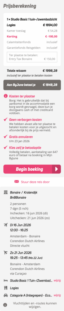 BonaireEen rustige, maar zeer centrale plek op Bonaire… Welkom bij BnBBonaire! De Nederlandse eigenaren staan open voor een praatje en voorzien je graag van de beste tips om het verblijf zo aangenaam mogelijk te maken. Tipje van de sluier: ga vogels spotten in de tropische tuin of ontdek de onderwaterwereld tijdens het snorkelen. Tijd over? Wandel dan op je gemak naar het centrum van Kralendijk voor een verkoelende awa di lamunchi. Voor een dosis zon, zee en strand zijn jullie bij BnBBonaire helemaal aan het juiste adres!
