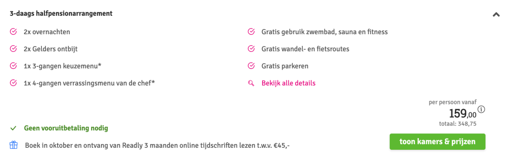 Disclaimer: deze prijs is excl. €14,95 boekingskosten per boeking.