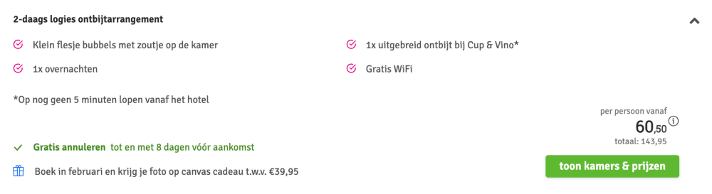 Disclaimer: deze prijs is excl. €14,95 boekingskosten per boeking.