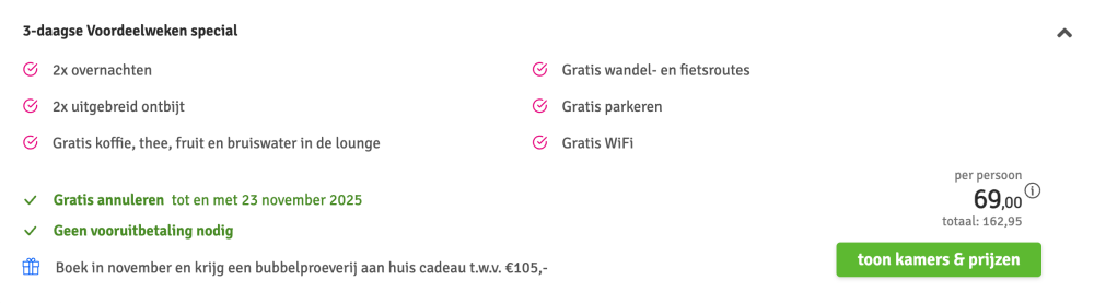 Disclaimer: deze prijs is excl. €14,95 boekingskosten per boeking.