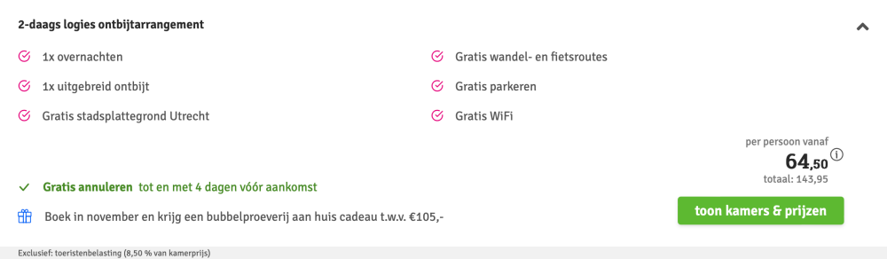 Disclaimer: deze prijs is excl. €14,95 boekingskosten per boeking.