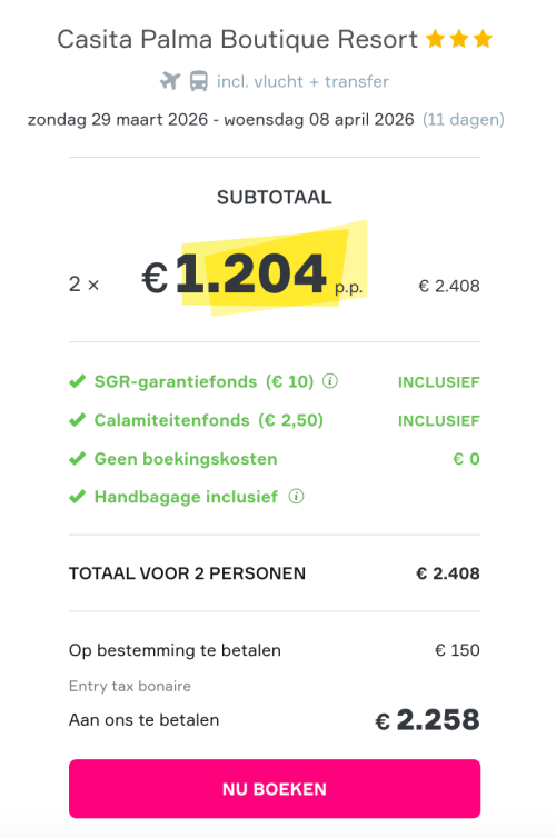 BonaireEen tropisch verblijf op een fantastische locatie… Welkom bij het kleinschalige Casita Palma aan de rand van Kralendijk. Een verkoelende duik in het zwembad of een goed boek lezen op het terras: het kan allemaal bij Casita Palma. Willen jullie meer van de omgeving zien? Vanuit de accommodatie wandelen jullie zo naar allerlei hotspots en hippe restaurantjes in het centrum. Ook raden we het altijd aan om een auto te huren op Bonaire, zo kun je gemakkelijk naar de mooiste baaitjes van het eiland. Pak de koffers maar in!