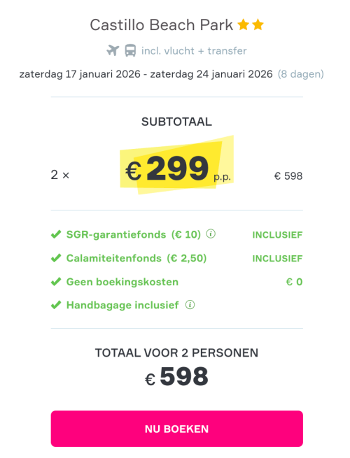 FuerteventuraVerblijf in je eigen bungalow op het zonnige Fuerteventura, hoe heerlijk klinkt dat! Je wordt rustig wakker met de zon die langs de gordijnen schijnt, met het zwembad voor de deur. Dat is pas vakantiegevoel! Ontspan op de comfortabele ligbedden langs het zwembad en neem af en toe een verfrissende duik. Liever naar het strand? Na een korte wandeling kom je bij het prachtige Playa del Castillo. Het Castillo Beach Park ligt op slechts 1,2 kilometer van het levendige centrum van Caleta de Fuste, waar je veel restaurants en winkels vindt. Het park zelf heeft ook een restaurant, bar, wellnesscentrum én verschillende sportfaciliteiten.