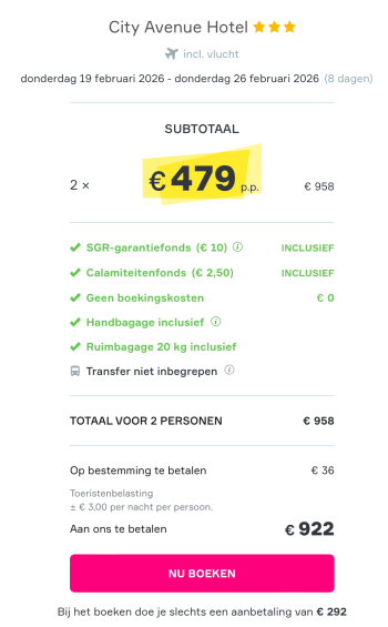 DubaiVink jullie bucketlist maar af… Want jullie vieren binnenkort vakantie in het magische Dubai. Verblijf in het moderne City Avenue Hotel en ontdek wat deze bijzondere bestemming allemaal voor jullie in petto heeft. Om af te koelen kunnen jullie een plons nemen in het zwembad. Proef de lokale gerechten in het restaurant en laat je verrassen door een explosie aan smaken. Net iets te veel gegeten? Geen probleem! Je schuld kun je namelijk gewoon eraf sporten in de gym. Maar het is tenslotte vakantie, dus genieten hoort erbij…