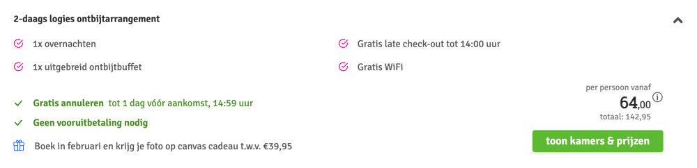 Disclaimer: deze prijs is excl. €14,95 boekingskosten per boeking.