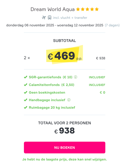 TurkijeOp loopafstand van het strand van de Turkse badplaats Side ligt het luxe Hotel Dream World Aqua. De naam zegt al genoeg… Hier zijn de echte waterratten helemaal aan het juiste adres! Neem een duik in één van de zwembaden en probeer alle glijbanen die er te vinden zijn op het resort. Daarnaast staat het animatie team iedere dag voor je klaar met leuke activiteiten. In de avond nemen jullie plaats in één van de restaurants & bars en gaan jullie en heerlijke avond tegemoet. Dat wil jij toch ook?