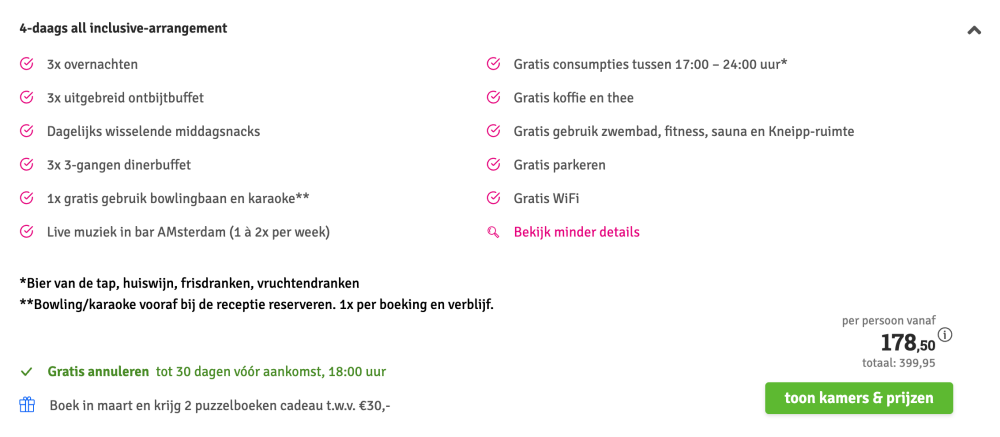 Disclaimer: deze prijs is excl. €14,95 boekingskosten per boeking.
