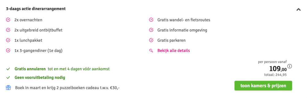 Disclaimer: deze prijs is excl. €14,95 boekingskosten per boeking.