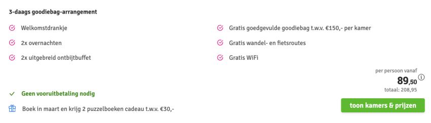 Disclaimer: deze prijs is excl. €14,95 boekingskosten per boeking.