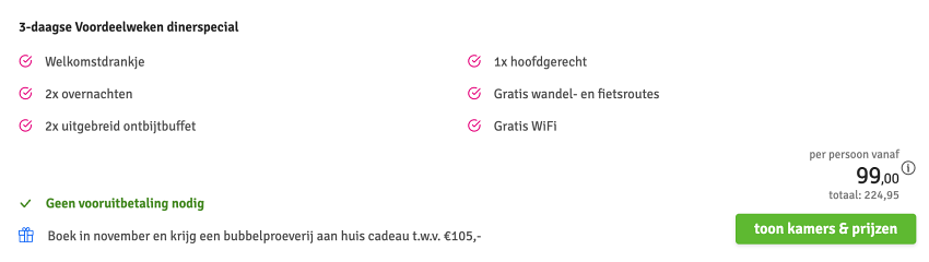 Disclaimer: deze prijs is excl. €14,95 boekingskosten per boeking.