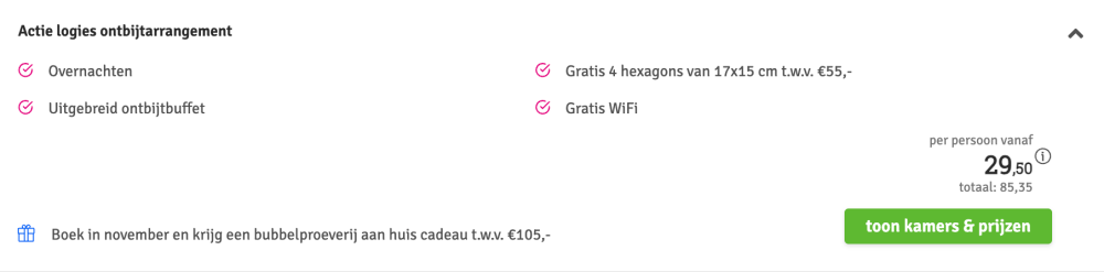 Disclaimer: deze prijs is excl. €14,95 boekingskosten per boeking.