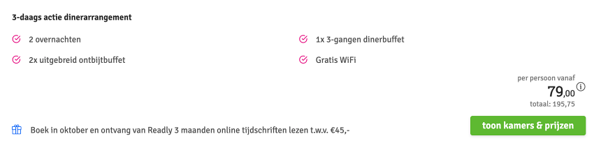 Disclaimer: deze prijs is excl. €14,95 boekingskosten per boeking.