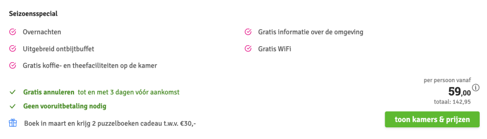 Disclaimer: deze prijs is excl. €14,95 boekingskosten per boeking.