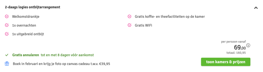 Disclaimer: deze prijs is excl. €14,95 boekingskosten per boeking.