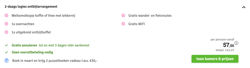 Disclaimer: deze prijs is excl. €14,95 boekingskosten per boeking.