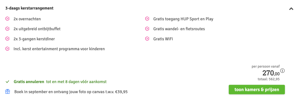 Disclaimer: deze prijs is excl. €14,95 boekingskosten per boeking.