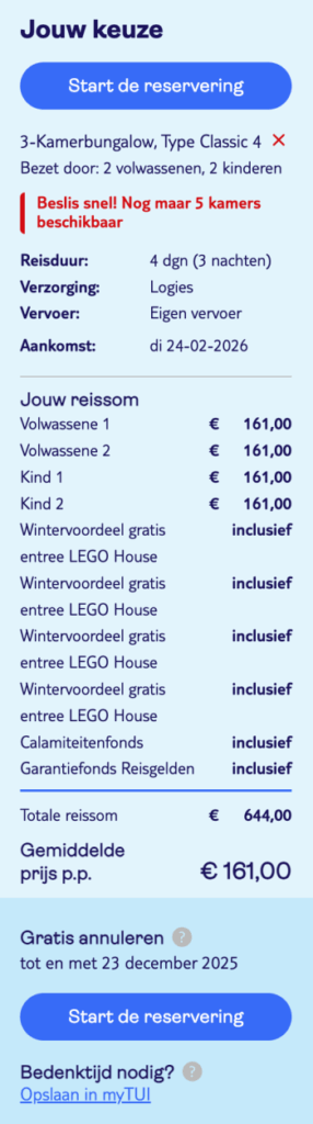 TIP: boek een verblijf in de periode 29 januari t/m 27 maart 2026 bij TUI (winterarrangement) en profiteer van allerlei voordelen. Zo ontvang je bij check-in een gratis LEGO cadeau (1 per boeking) t.w.v. € 29 en een gratis Activity Card (1 per boeking) t.w.v. DKK 500 (€ 65). Deze kun je gebruiken om mee af te rekenen bij de activiteiten (bijv. bowlen of mini-golf) in het hoofdgebouw van Lalandia Billund. En je hebt tijdens je verblijf per persoon 1x gratis entree tot LEGO House, in het centrum van Billund. LEGO House is een magische plek waar je volledig opgaat in de wereld van LEGO, met interactieve speelzones, coole bouwuitdagingen en toffe LEGO-creaties. Het is de ideale plek voor zowel kinderen als volwassenen om creativiteit te ontdekken en samen te bouwen!