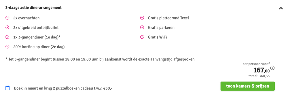Disclaimer: deze prijs is excl. €14,95 boekingskosten per boeking.