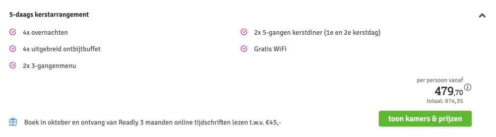 Disclaimer: deze prijs is excl. €14,95 boekingskosten per boeking.