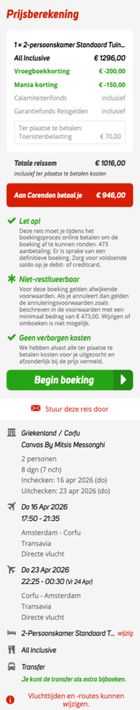 CorfuEen geliefd adresje voor jong en oud: Messonghi Beach op Corfu. Dit ruim opgezette vakantiecomplex, gelegen nabij een authentiek dorpje, is een populair hotel waar diverse nationaliteiten samenkomen. Ontspan in de gerenoveerde kamers en laat je verrassen door het animatieteam. De kleintjes vermaken zich bij de miniclub, terwijl jij van de faciliteiten geniet. Wanneer je het hotel verlaat sta je zo op het strand. Hoe ideaal is dat? Met alle voorzieningen en activiteiten binnen handbereik, belooft dit een onvergetelijke vakantie te worden.