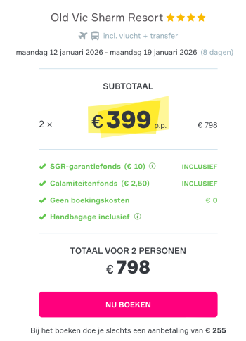 EgypteOp naar een zonnige en luxe vakantie in het heerlijke Egypte! In welk hotel? In hotel Old Vic Sharm Resort natuurlijk! In dit fijne 4-sterren hotel vind je alles wat je nodig hebt voor een onvergetelijke vakantie. Zwemmen, fitnessen, snorkelen, duiken, waterpolo, basketbal of beachvolleybal, alles kan! Daarnaast kun je compleet ontspannen in de uitgebreide wellness en word je dagelijks vermaakt door het animatieteam. Als je gaat voor een ontspannen all inclusive vakantie, geniet je van de twee buffetrestaurants, de lobbybar en de zwembadbar (met snacks!).