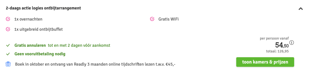 Disclaimer: deze prijs is excl. €14,95 boekingskosten per boeking.