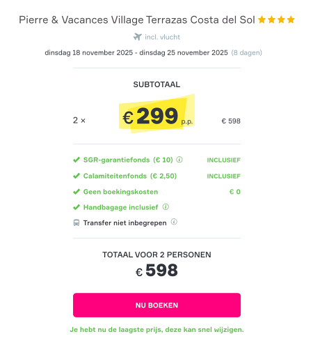 SpanjeZin in een vakantie aan de Costa del Sol? Verblijf dan in het fijne Pierre & Vacances Village Terrazas Costa del Sol en ga een geweldige vakantie tegemoet. Zowel jong als oud hoeft zich hier geen seconde te vervelen… Dompel jezelf onder in het zwembad, doe actief mee met het entertainmentprogramma of bestel wat lekkers bij de bar. Snel wat boodschapjes halen? Dat kan in de minimarkt in het hotel. In de omgeving zijn verschillende golfbanen en een heerlijk strand te vinden. Zien we jullie binnenkort aan deze Spaanse Costa?