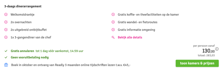 Disclaimer: deze prijs is excl. €14,95 boekingskosten per boeking.