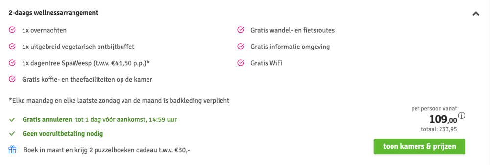 Disclaimer: deze prijs is excl. €14,95 boekingskosten per boeking.