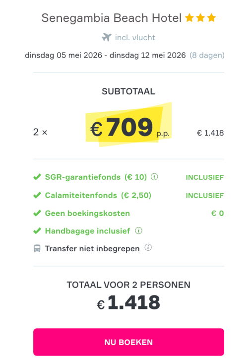 GambiaHotel Senegambia Beach ligt in het hart van Kololi, waardoor het ongelooflijk centraal ligt. Het hotel ligt direct aan het strand en de Senegambia Strip, ideaal… Senegambia Beach Hotel heeft een tropische tuin vol met apen en vogels, je kijkt je ogen uit. Relax op een strandbedje in de zon en neem een duik in Atlantische Oceaan om af te koelen. Zin in een lekker diner? Ontdek alle Gambiaanse specialiteiten in één van de restaurants van Senegambia Beach. Tip: De Local Lunch Experience mag je zeker niet missen!