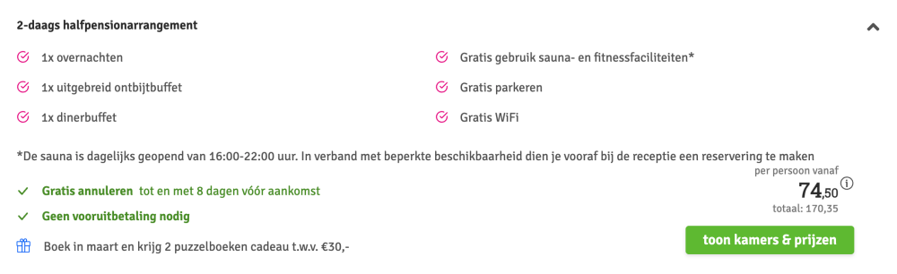 Disclaimer: deze prijs is excl. €14,95 boekingskosten per boeking.