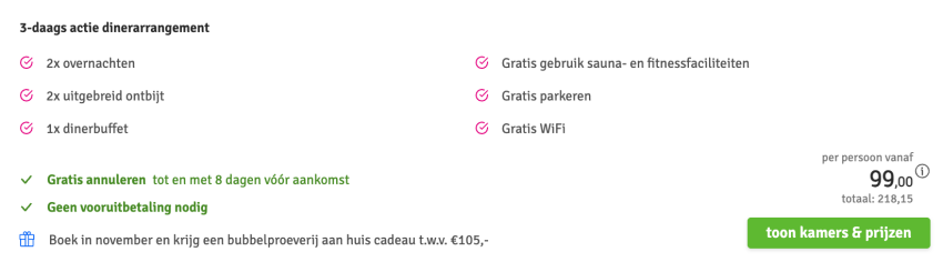 Disclaimer: deze prijs is excl. €14,95 boekingskosten per boeking.