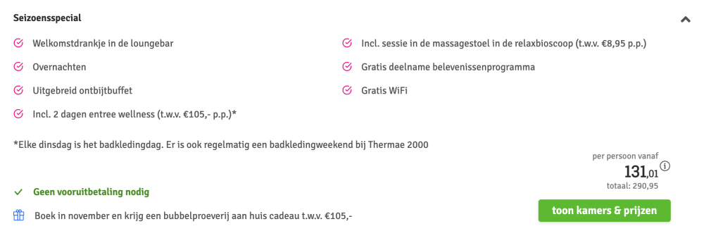 Disclaimer: deze prijs is excl. €14,95 boekingskosten per boeking.