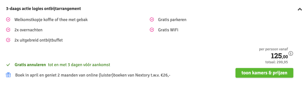 Disclaimer: deze prijs is excl. €14,95 boekingskosten per boeking.