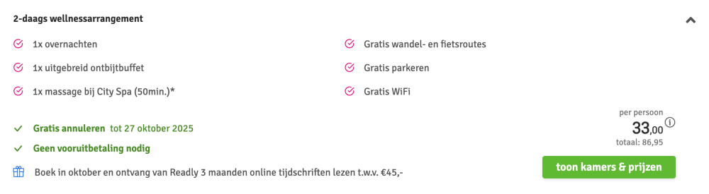 Disclaimer: deze prijs is excl. €14,95 boekingskosten per boeking.
