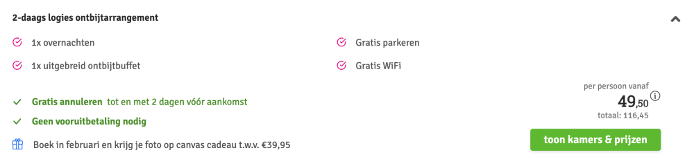 Disclaimer: deze prijs is excl. €14,95 boekingskosten per boeking.