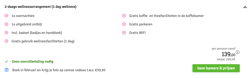 Disclaimer: deze prijs is excl. €14,95 boekingskosten per boeking.