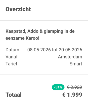 AfrikaTintelen je vingers van het verlangen om op ontdekkingstocht te gaan? Maak je dan klaar voor een roadtrip avontuur in Zuid-Afrika, waar safaridagen en glamping nachten je staan op te wachten! Eerst verken je Kaapstad en al zijn hoogtepunten: van de pinguïns op Boulders Beach tot Kaap de Goede Hoop en van het centrum downtown tot de Tafelberg. Dan is het tijd om je gordel om te doen en over de Garden Route te rijden, waarschijnlijk de mooiste kuststrook ter wereld! Je constante metgezellen zijn de diepblauwe zee, ruige kliffen en dromerige zandstranden. Ga op selfdrive safari in Addo National Park en met een beetje geluk heb je aan het eind van de dag alle Big Five gezien. De olifanten in Addo worden gevolgd door struisvogels in Oudtshoorn, die tegen elkaar racen in de uitgestrektheid van de Zuid-Afrikaanse wildernis. Zelfs ’s nachts ben je slechts door het dak van je glampingtent gescheiden van de Zuid-Afrikaanse wildernis. Waar wacht je nog op: volg de roep van de wildernis!