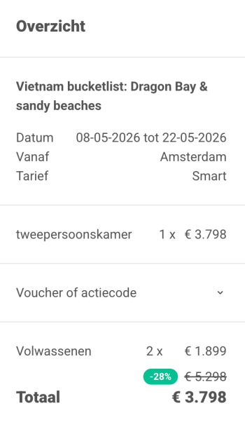 AziëBruisende steden, heerlijk streetfood, levendige cultuur en paradijselijke stranden… Welkom in Vietnam! Begin in het noorden en ontdek de mysterieuze bezienswaardigheden van Hanoi terwijl je je onderdompelt in de geschiedenis van het land. Je treedt in de voetsporen van draken en bewondert de unieke rotsformaties van Halong Bay voordat je doorreist naar Centraal-Vietnam. Het betoverende Hoi An biedt perfecte fotomomenten tussen kleurrijke lantaarns en schattige winkeltjes. Een halte later beland je in het strandparadijs in het zuiden van het land: witte zandstranden, turquoise water en spectaculaire natuur. Dat is Phu Quoc op zijn best! En de grande finale: Ho Chi Minhstad. Van stadswandelingen en streetfood crawls tot uitjes naar het platteland, op deze reis komen dromen uit!