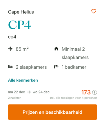 Disclaimer: prijzen bij Roompot zijn incl. reserveringskosten en verplichte extra’s en zijn excl. waarborg, toeristenbelasting p.p.p.n. (variërend per park) en op enkele parken gelden persoonsgebonden verplichte extra’s als bedlinnen en parklasten.