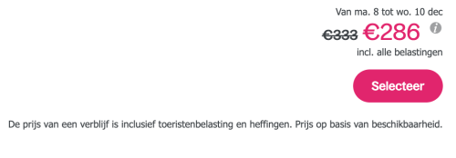 Disclaimer: deze prijs is exclusief heffingen en verplichte toeristenbelasting (op basis van het aantal personen en aantal nachten).