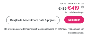 Disclaimer: deze prijs is exclusief heffingen en verplichte toeristenbelasting (op basis van het aantal personen en aantal nachten).