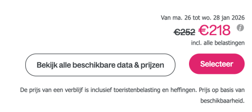 Disclaimer: deze prijs is exclusief heffingen en verplichte toeristenbelasting (op basis van het aantal personen en aantal nachten).
