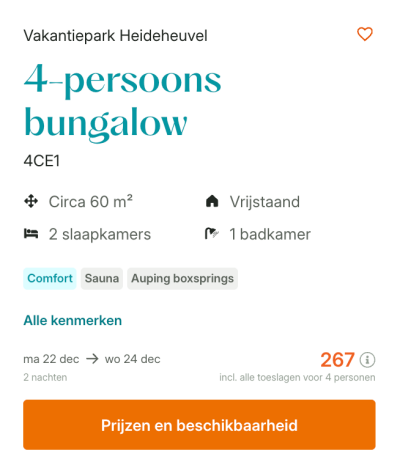 NederlandOmringd door het groen van de natuur vinden jullie het populaire Landal Heideheuvel. Dit prachtige vakantiepark is een perfecte plek voor jong en oud. Verken de bosrijke omgeving van Beekbergen, terwijl de kids zich uren kunnen vermaken in het overdekte zwembad of het avonturenhof. Landal Heideheuvel heeft daarnaast ook de beschikking over verschillende eetmogelijkheden (van een snelle snack tot aan een vernieuwde brasserie), zodat jullie echt kunnen genieten van een onbezorgde vakantie bij de Veluwe.